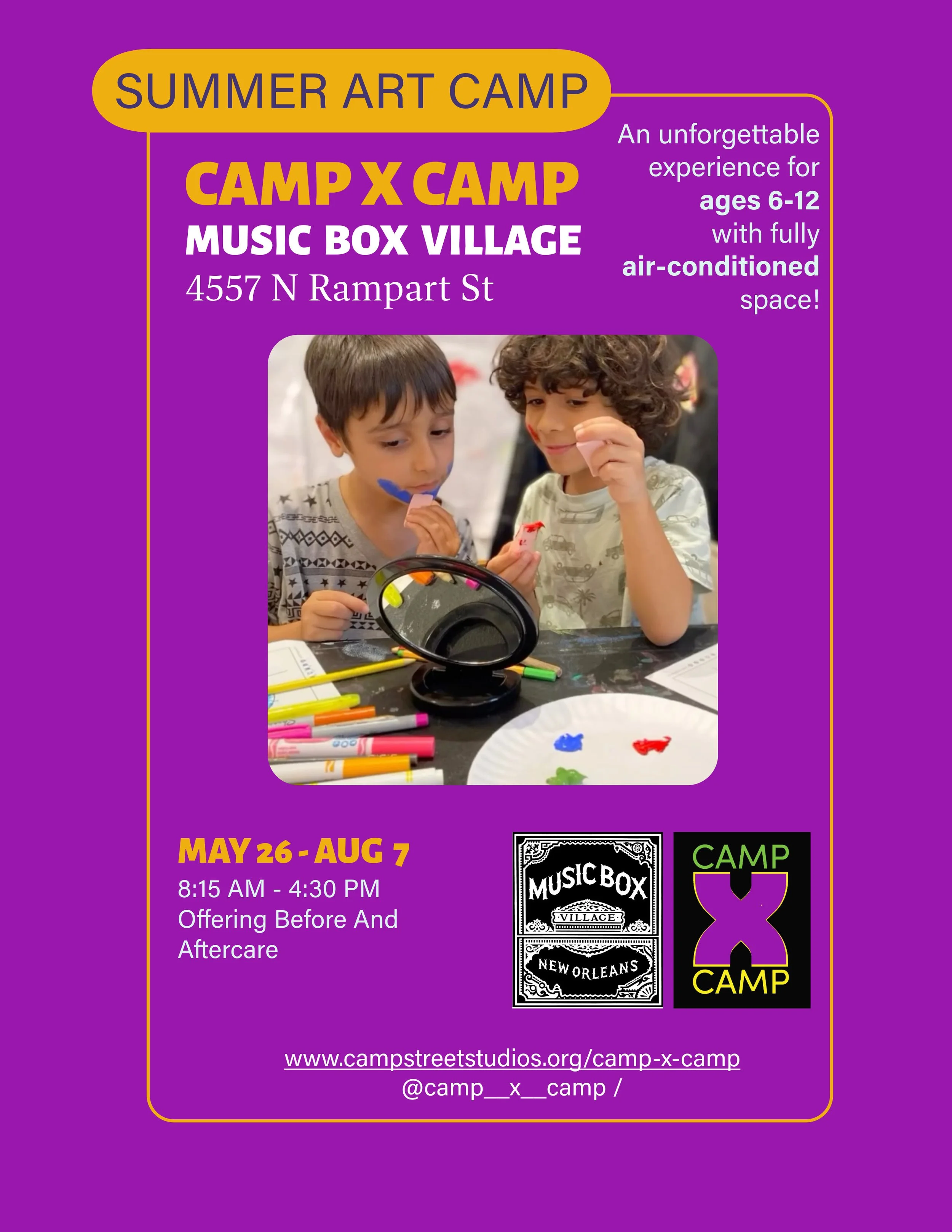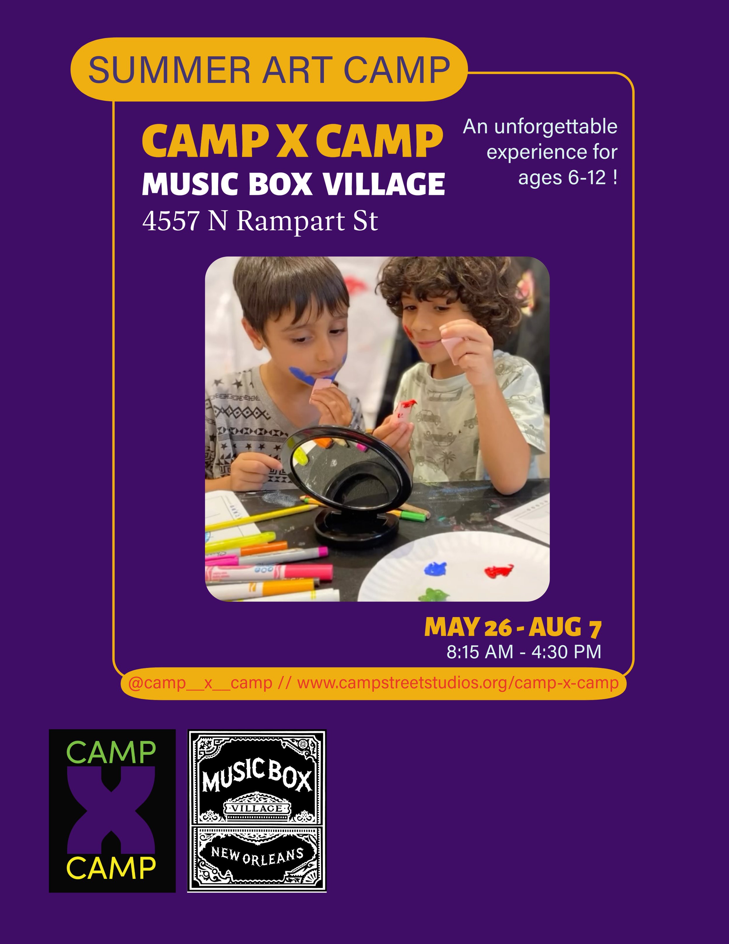 Camp X Camp is a joyful, art-filled summer experience where young creatives get messy, make magic, and grow as artists, guided by incredible working artists and educators of New Orleans.